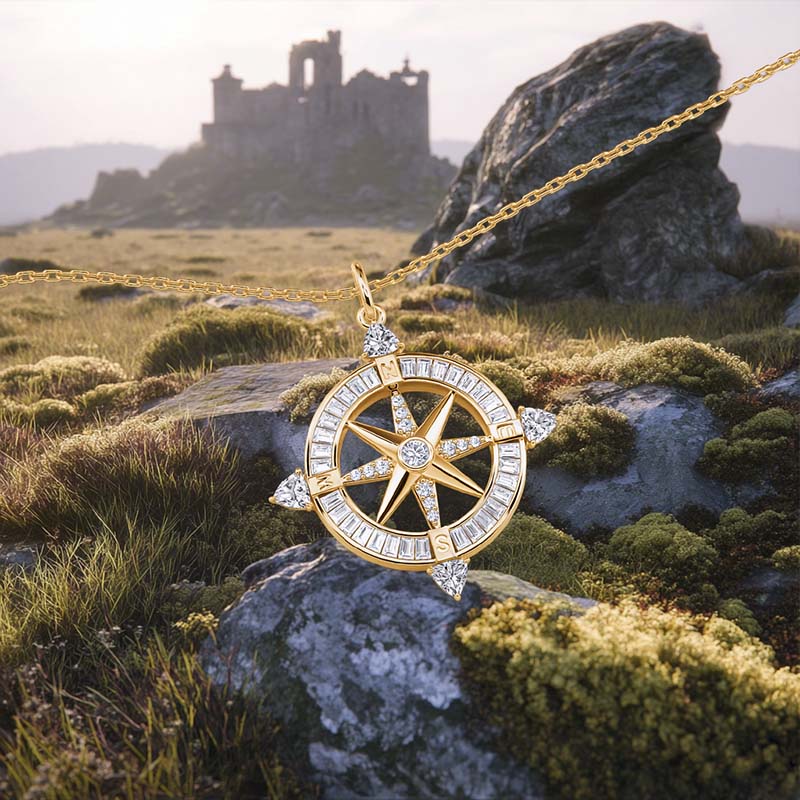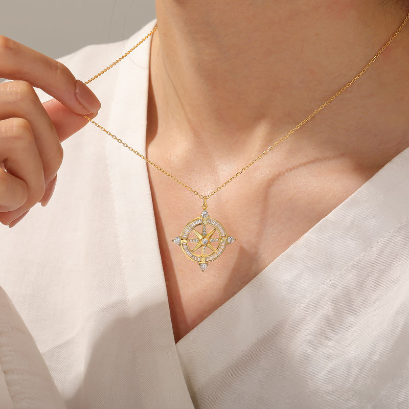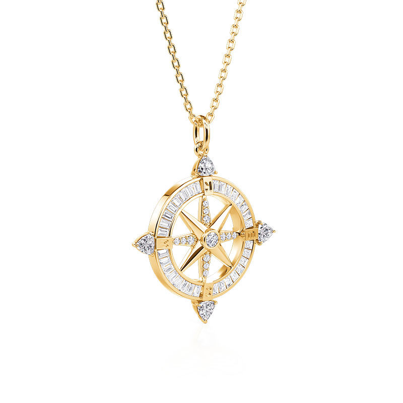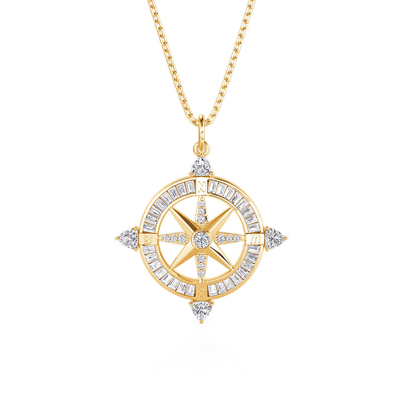 O colar Compass Pendant da Jeulia, revestido em ouro amarelo, reimagina o clássico motivo da bússola como um símbolo portátil de orientação e beleza. Em seu núcleo, uma peça central em forma de estrela ocupa o palco, ancorada por uma pedra em corte redondo que captura e reflete a luz a cada rotação. Ao redor dela, os "raios" da bússola e o anel externo apresentam uma mistura cuidadosamente selecionada de cortes de pedras preciosas: cortes redondos cintilantes adicionam um brilho delicado, cortes trillion ousados trazem drama geométrico aos pontos cardeais, e cortes baguete elegantes bordejam o perímetro em um brilho linear polido. Mais do que um acessório, este colar de bússola é um tributo à exploração – perfeito para uso diário ou como um presente significativo para o sonhador da sua vida. Deixe o seu calor dourado e o brilho das pedras preciosas de múltiplos cortes serem a sua bússola de estilo, guiando - você para uma elegância esforçada a cada uso.