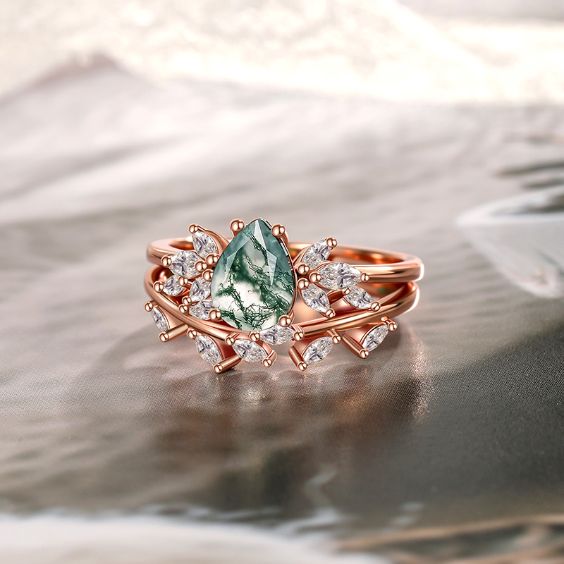 Jeulia Conjunto de Anéis Floresta Decídua Ágata Musgo Corte Pêra
