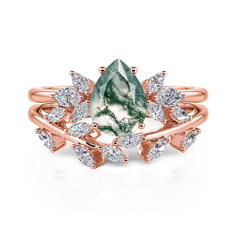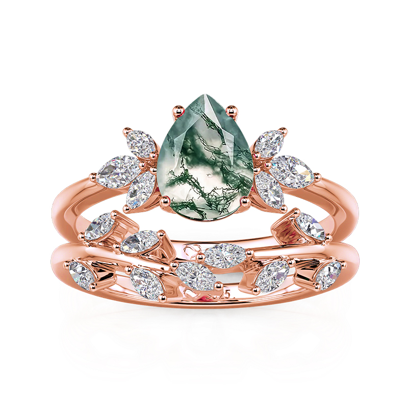 O conjunto de anéis Jeulia "Forest Deciduous" com ágata musgo talhe pêra exibe um cabochão de ágata musgo vejado com sussurros florestais, repousando sobre ramos de ouro rosa salpicados de peridotos foliformes. A banda complementar desdobra-se como um dossel outonal, seus citrinos graduados imitam folhagem cadente. Empilha-os para usar alquimia silvestre—a paciência da terra encontra o calor do ouro—ou deixa a ágata solitária, uma relíquia musgosa num mundo polido.