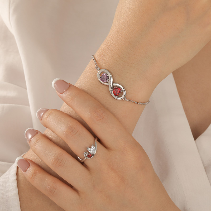 Com o símbolo do infinito no coração do design, esta pulseira personalizada de coração infinito apresenta o tema da eternidade e do amor. As duas pedras em forma de coração são ametista e rubi, simbolizando a profundidade e a paixão das emoções, entrelaçadas para formar um design único de coração duplo. O brilho das pedras preciosas é realçado pela corrente de prata, lembrando os momentos cintilantes do amor. A parte central da pulseira de coração infinito pode ser personalizada com gravações, permitindo que o usuário lembre do profundo compromisso e das memórias com seu ente querido, aumentando o valor emocional desta joia. O produto oferece serviços de personalização: os clientes não só podem escolher diferentes cores de metal, mas também personalizar o tom das pedras preciosas de acordo com suas preferências pessoais, conferindo a cada pulseira uma personalidade e conotação únicas.