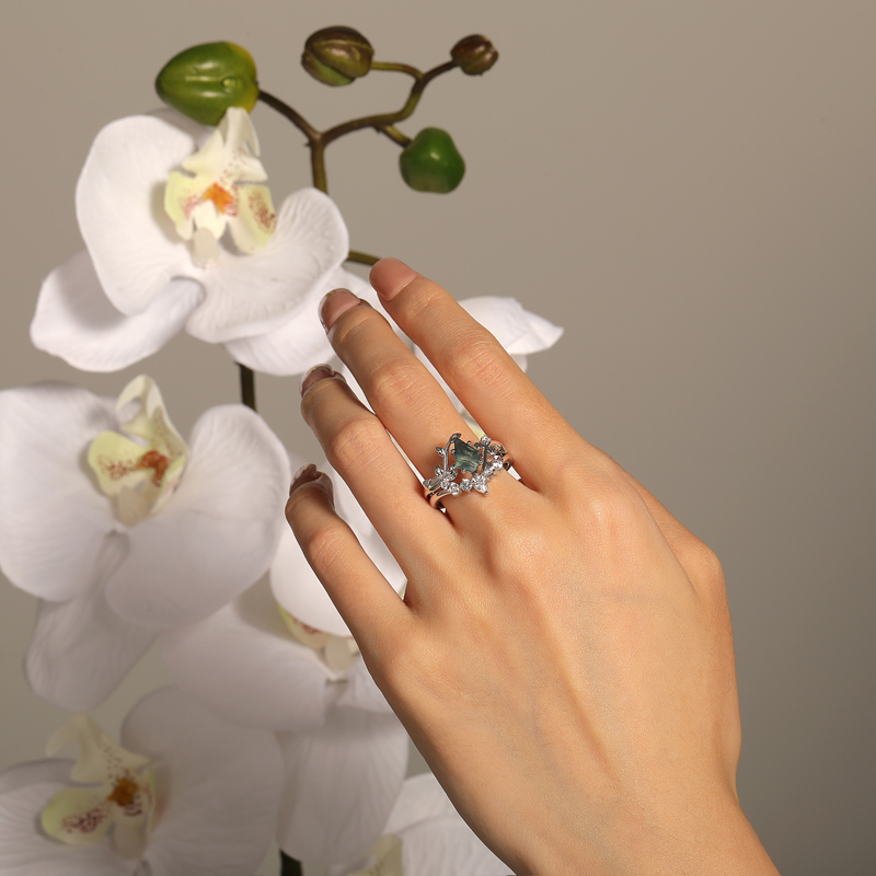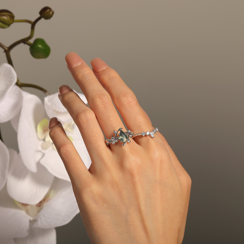 Uma ágata musgo corte pipa, veiada com sussurros de florestas antigas, repousa numa banda envolta em folhas de prata. As veias pavé das folhas pulsam luz, acolhendo a pedra como raízes abraçando uma relíquia. A banda enhancer abre-se com esmeraldas graduadas – use este conjunto de ágata musgo como alma da floresta, ou deixe a ágata solitária como confissão silenciosa da terra.