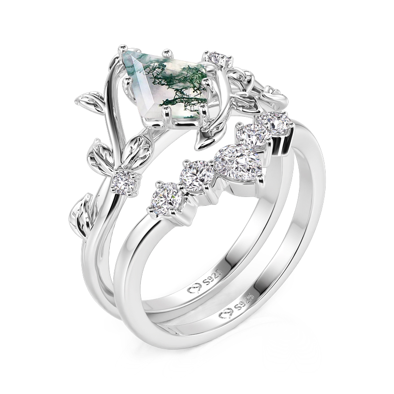 Jeulia Conjunto de Anéis de Ágata Musgo Envolvida por Folhas Prata Sterling