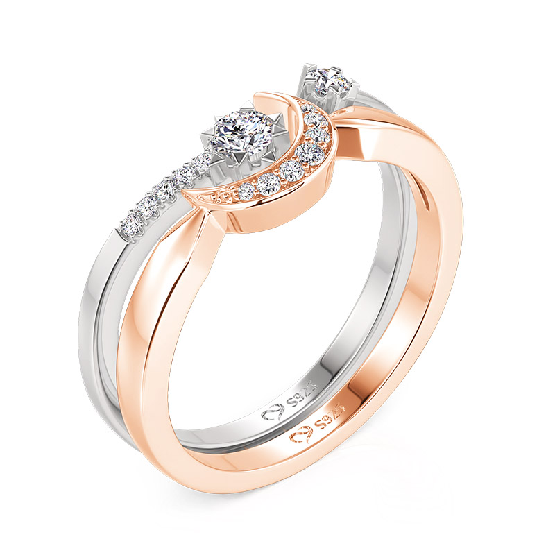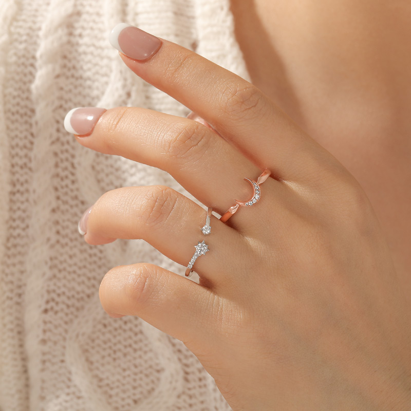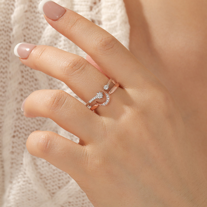 Este conjunto de anéis puzzle de lua e estrelas apresenta um sabor artístico delicado com um processo de banho bicolor, como as estrelas cintilantes no céu noturno e a suave lua refletindo uma à outra. A lua em ouro rosa no centro é tão elegante quanto um poema, simbolizando sonho e esperança, enquanto os pequenos diamantes incrustados na superfície da lua são como luz estelar derramada, emitindo um brilho espiritual, como se contassem os segredos do universo. As estrelas prateadas, por outro lado, são desenhadas com linhas minimalistas que delineiam a imensidão do céu estrelado, criando junto com as curvas da lua um diálogo afetuoso. O design geral não apenas evoca uma cena noturna romântica, mas também revela perfeitamente a personalidade e o gosto de quem o usa, como se cada vez que você o veste fosse uma jornada de diálogo com as estrelas, cheia de fantasia e poesia desejáveis.