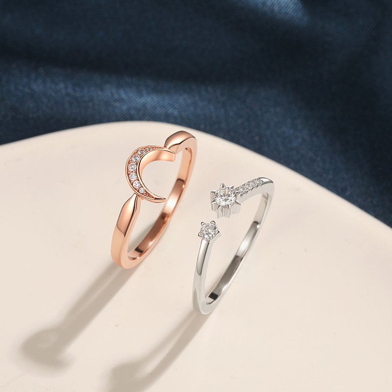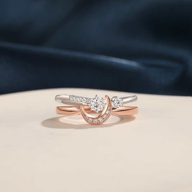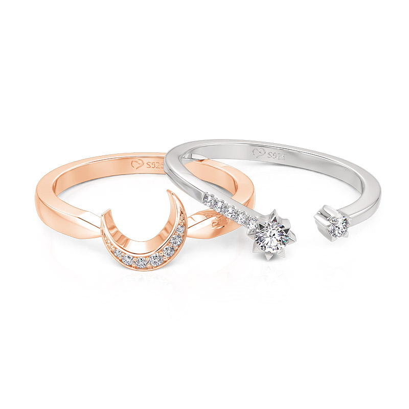 Jeulia Conjunto de Anéis Puzzle Lua e Estrela em Dois Tons de Prata Sterling