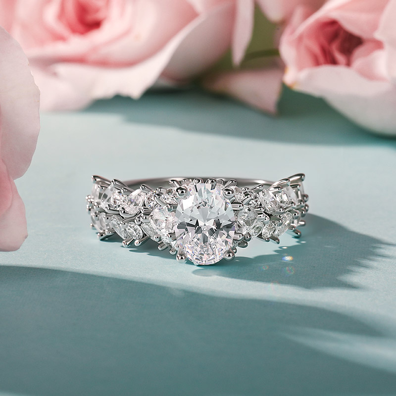Tämä Jeulia Olivetta ovaali kihlasormus piilotetulla halolla yhdistää innovatiivisen kluster-tyylin: markiisi- ja pyöreät kivet on aseteltu huolellisesti sormuksen vanneelle. Ne kietovat ovaalin muotoista keskuskiveä kuin tähdet kuuta ja luovat visuaalisen halo-efektin. Ovaalin pehmeät ääriviivat kontrastoivat kiehtovasti geometrisen kluster-designin kanssa, ja sormuksen sujuvat linjat sopivat mukavasti sormeen. Täydellinen kynttilänvalossa tehtäville kosinnanhetkille – piilotettu halo syttyy yhtäkkiä loistavaksi valonheitimeksi.
